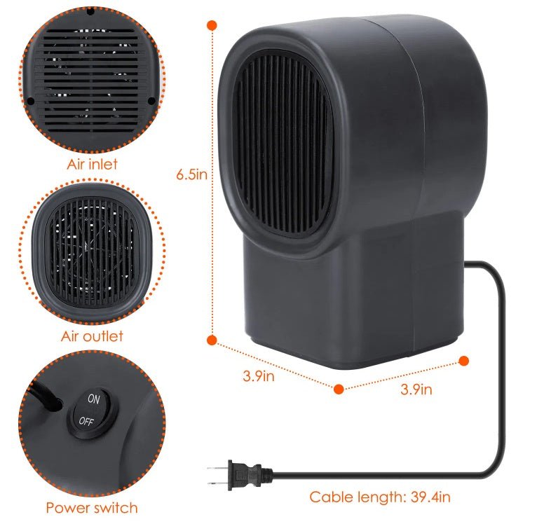*Portable*:Dimensions:6.5x3.9x3.9in. You can carry this compact unit from room to room and enjoy customized heating anywhere!It comes in one piece and often fits on a table top,ideal for small areas like bathrooms,kitchen,basement,garage,and so on.