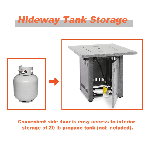- User-friendly Design - Verstile output for the fire pit. An easy access door allows you to conceal a 20 lbs. propane tank (not included).The handle design makes it easier to check or replace the gas cylinder. The built-in hook on the table lid also makes it more convenient for you to pick.