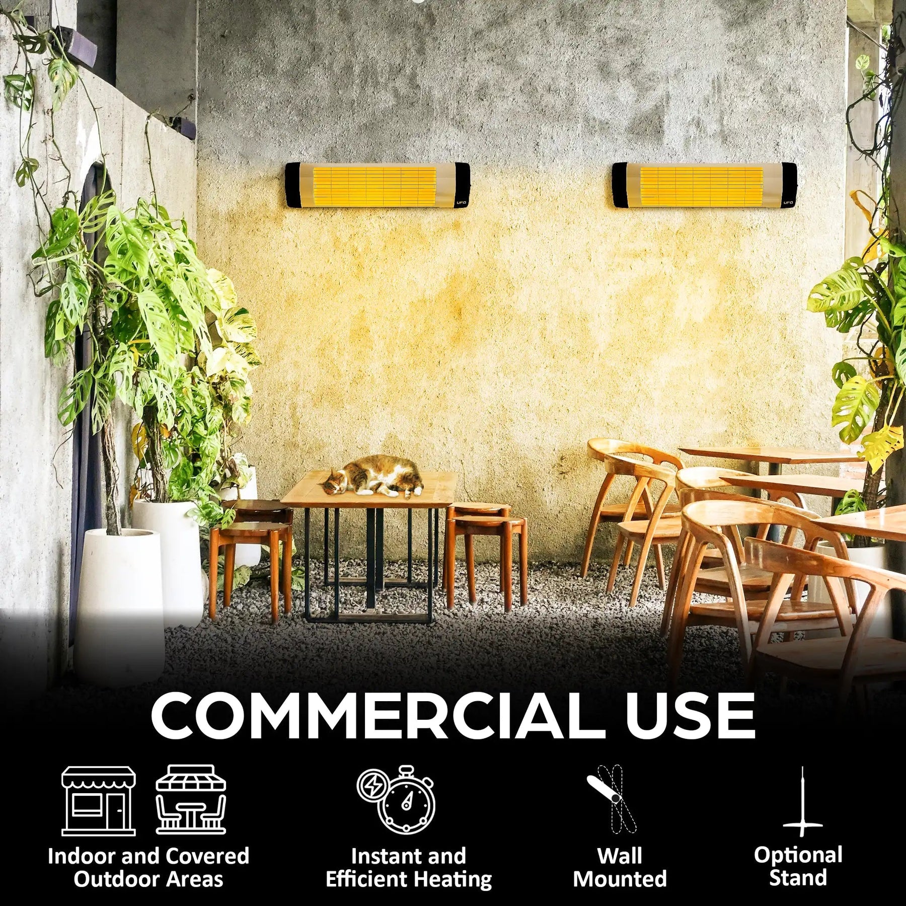 Weatherproof and authorized to use as an infrared heater indoors and outdoors, the UFO S-15's rustproof aluminum shell is ideal for a variety of locations, including your house, backyard, patio, balcony, gazebo, restaurant, gym, and workshop to name a few.