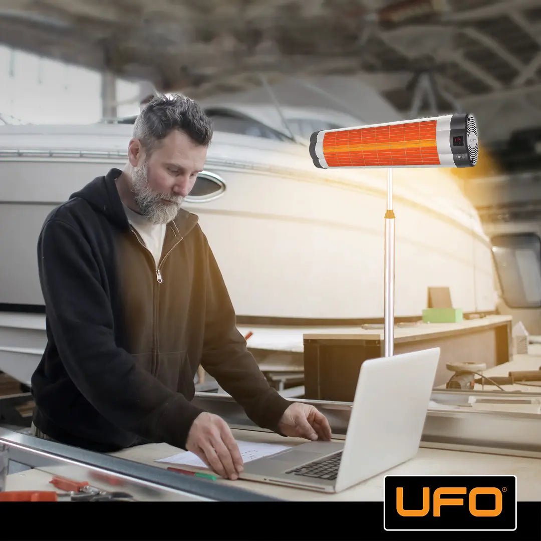 UFO space heaters are safe for use around living beings since they use medium-wave infrared heating technology. When mounted horizontally on a telescopic stand, they can heat up to 160 sq. ft. indoors or 105 sq. ft. outdoors.